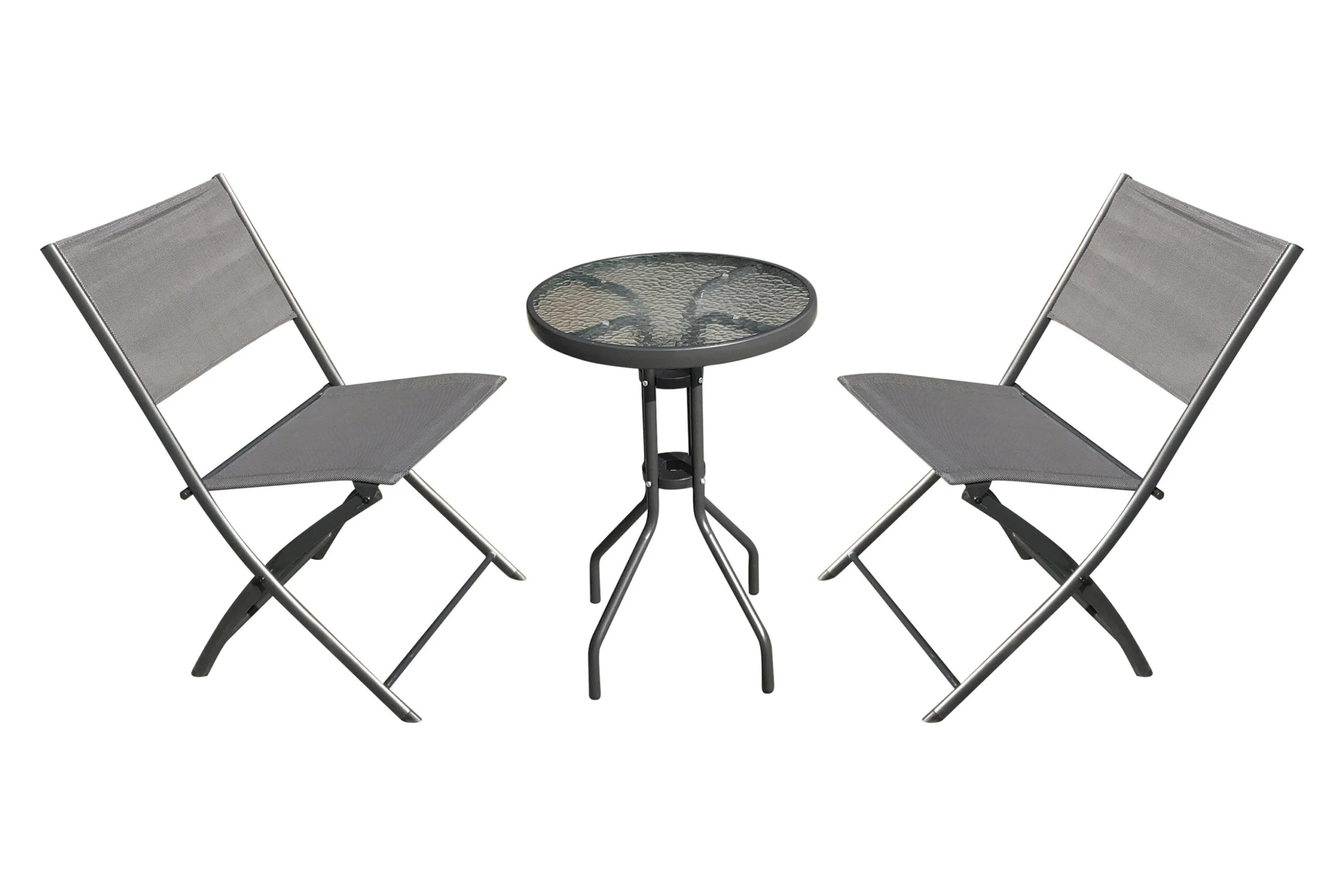 Consists of 2 folding chairs & 50cm diameter glass (tempered) topped table
