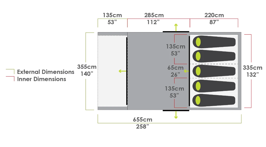 With a spacious full head-height living area, large front awning area, and versatile Multi-Room bedroom system, the Evo TL V2 is built for comfort and flexibility. The size, layout, and inflatable airframe make it a perfect set-up for longer holidays with a small family while keeping weight and pack size to a minimum. SLEEPS (COMFORT) 4 SLEEPS (MAXIMUM) 5 SLEEPING AREAS (#) 1-3 LIVING AREAS (#) 1 PEAK HEIGHT (BEDROOM) 205cm / 80.7in PEAK HEIGHT (FLY) 215cm / 84.6in FRAME MATERIAL Inflatable airsystem tubes FLY FABRIC 150D, 135T poly oxford WATERHEAD RATING (FLY) 6,000mm UV RATING UPF 50 FLOOR MATERIAL 12×12, 140gsm PE INNER FABRIC 75D, 270T breathable polyester FRAME FEATURES Angled beam construction Double seal boston valve External inflation points Guide straps Inflatable air frame SeroLink™ frame system Tunnel design FABRIC FEATURES Durable PE floor Fire retardant treatment Torrential rain tested TPU tape seam sealed UV treatment FLY FEATURES Carpet attachment rings Integrated air frame Sewn in ground sheet Tinted skylights CONFIGURATION FEATURES Extended awning Full front opening Full head height Internal living area Removable inner Side openings (2) WINDOW FEATURES 3 way windows Adjusted internally Bug proof mesh Rear external window covers Side zipped internal window covers Skylight covers Tinted PVC Waterproof window covers VENTILATION FEATURES Anchor vents Bedroom vents Front to rear airflow Gusseted rear window Large mesh windows Living area lower draft vents Rear airflow window Side to side airflow Upper expel vents BEDROOM / INNER FEATURES 360° fold away inner door Light diffusing fabric Multi-room inner Twin layer D doors (2) Zip out dividing curtain (2) EXTERNAL DOOR FEATURES 360° fold away main door Central roll back door toggles Side access doors (2) Twin layer main door AWNING / GUSSET FEATURES Aerobase Evo Link Zip All weather access Awning wall set attachment system Inflatable awning Guide Straps Rain skirt LIGHT RIGGING SYSTEM Awning area LRS Bedroom area LRS Living area LRS PUMP FEATURES Aluminium shaft Carry bag included Double action Pressure gauge Pressure release valve PEGGING FEATURES Adjustable peg loops Steel D ring peg pointsSturdy moulded rings added to key peg loops to reduce wear on the webbing.