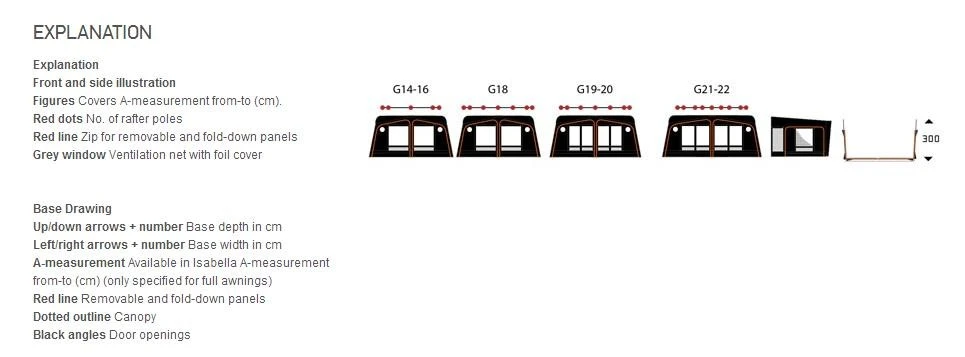 • Optional Extras: Annex 250, door canopy, net side, net front, Cosy Corner II, partition wall, front sun canopy, gutter, storm securing set.