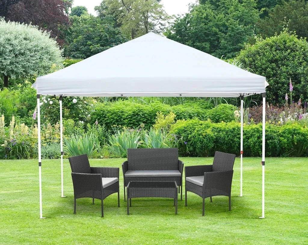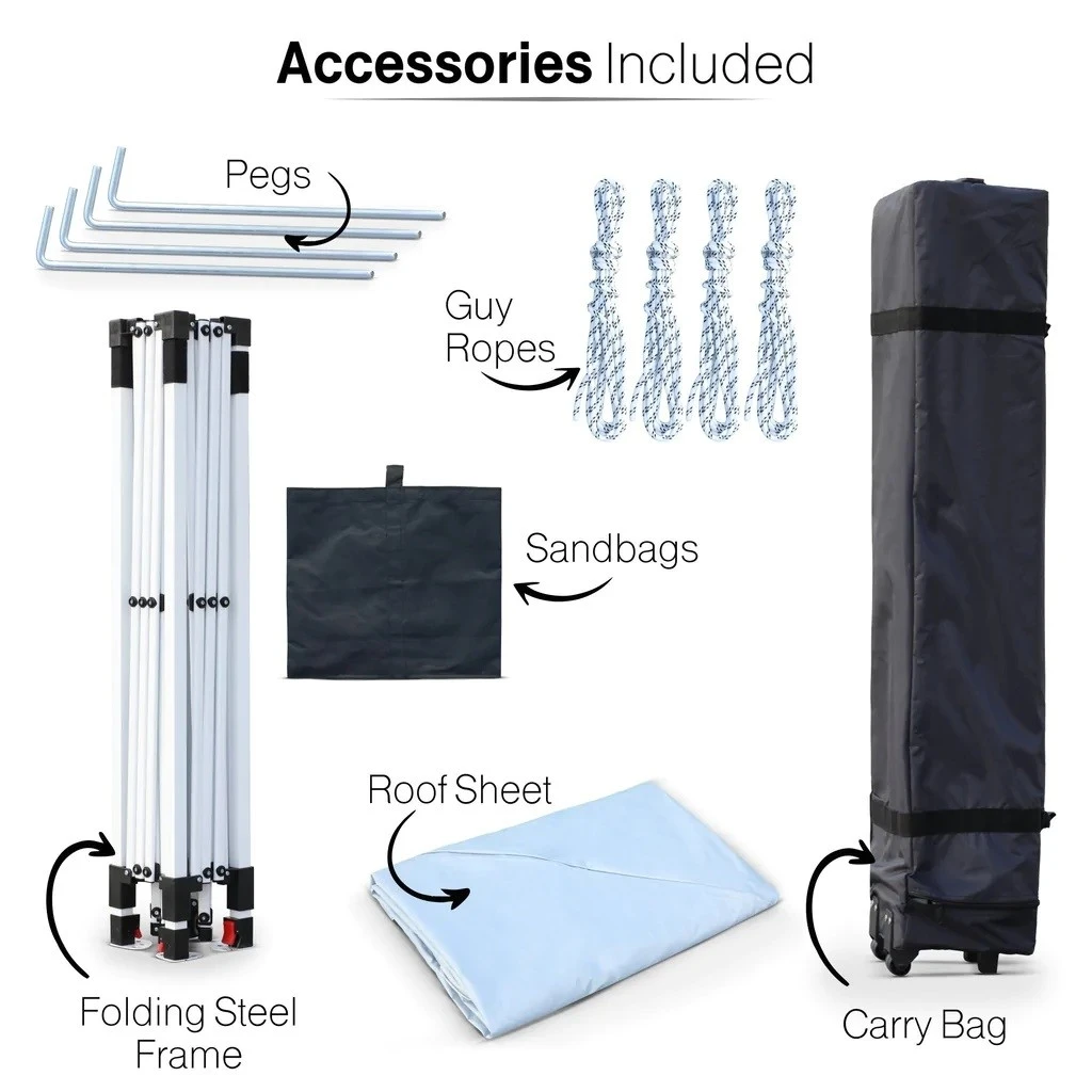 - SHOWERPROOF & WIND RESISTANT – The Pop Up Gazebo is the perfect summer solution – even during the notoriously unpredictable British weather. It features a rust-proof frame with PVC coated fabric polyester canopy to protect you from unexpected summer showers. It also features guy ropes and metal stakes to keep it anchored to the ground – plus it includes 4 sandbags (sand not included) to enable you to weigh it down to prevent it blowing away in the breeze or from sudden gusts of wind.
