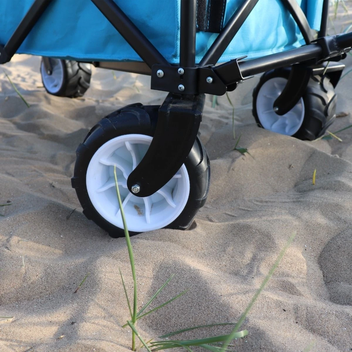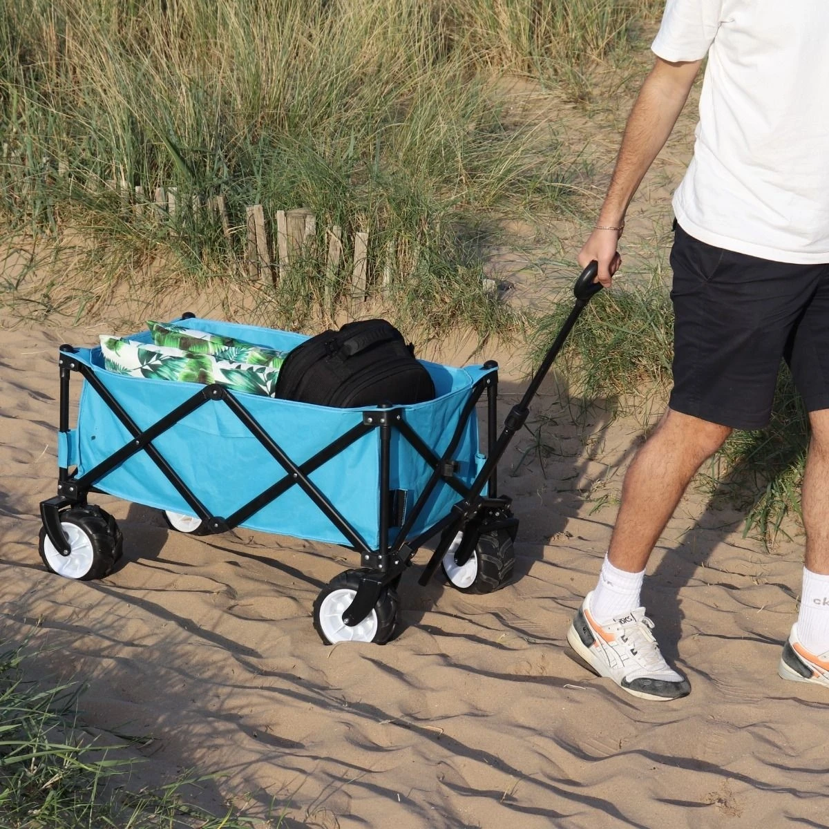 his folding all terrain trolley has a wide range of uses. Its heavy duty design makes it ideal for transporting items (including luggage) in caravan parks, motorhome parks, camping sites and beaches thanks to its specially designed wheels which allows you to navigate the trolley in bumpy terrain. It is also suitable for gardeners for carrying plants, garden waste and gardening equipment. This folding trolley has a durable steel frame that allows you to carry a maximum load of 80kg and it comes with a 600D polyester fabric that is resistant to all kinds of weather conditions.