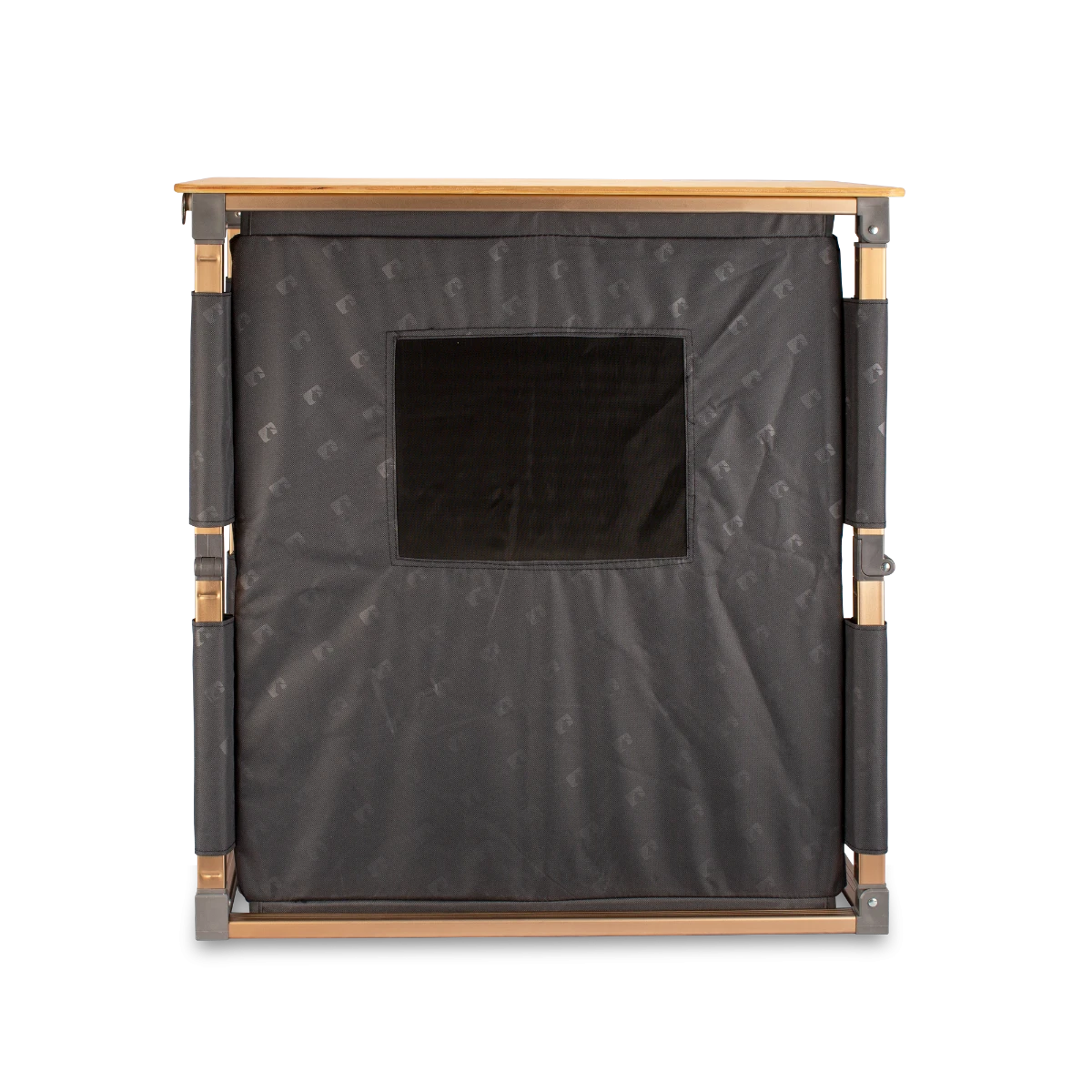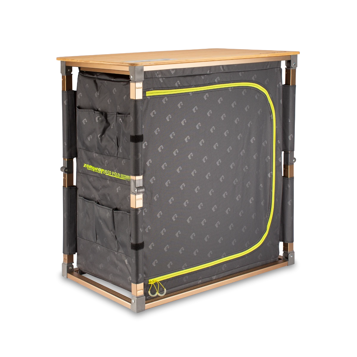 The Eco Fold Single V2 features a naturally weatherproof and heat-resistant bamboo tabletop and rustproof aluminium frame. A perfect working surface to cook and prepare camp meals. The zip-closed lower cupboard, along with side storage pockets, help to help keep your campsite organized. A retractable utility rack keeps utensils close at hand and can also store a basin for wash-up.