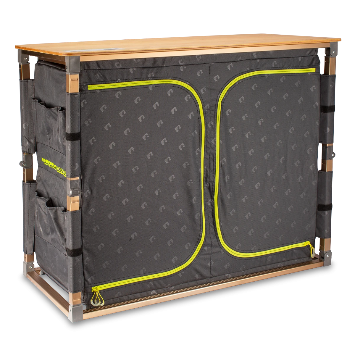 The Eco Fold Twin V2 features a naturally weatherproof and heat-resistant bamboo tabletop and rustproof aluminium frame. A perfect working surface to cook and prepare camp meals. The twin lower cupboards, along with side storage pockets, help to help keep your campsite organized. A retractable utility rack keeps utensils close at hand and can also store a basin for wash-up.