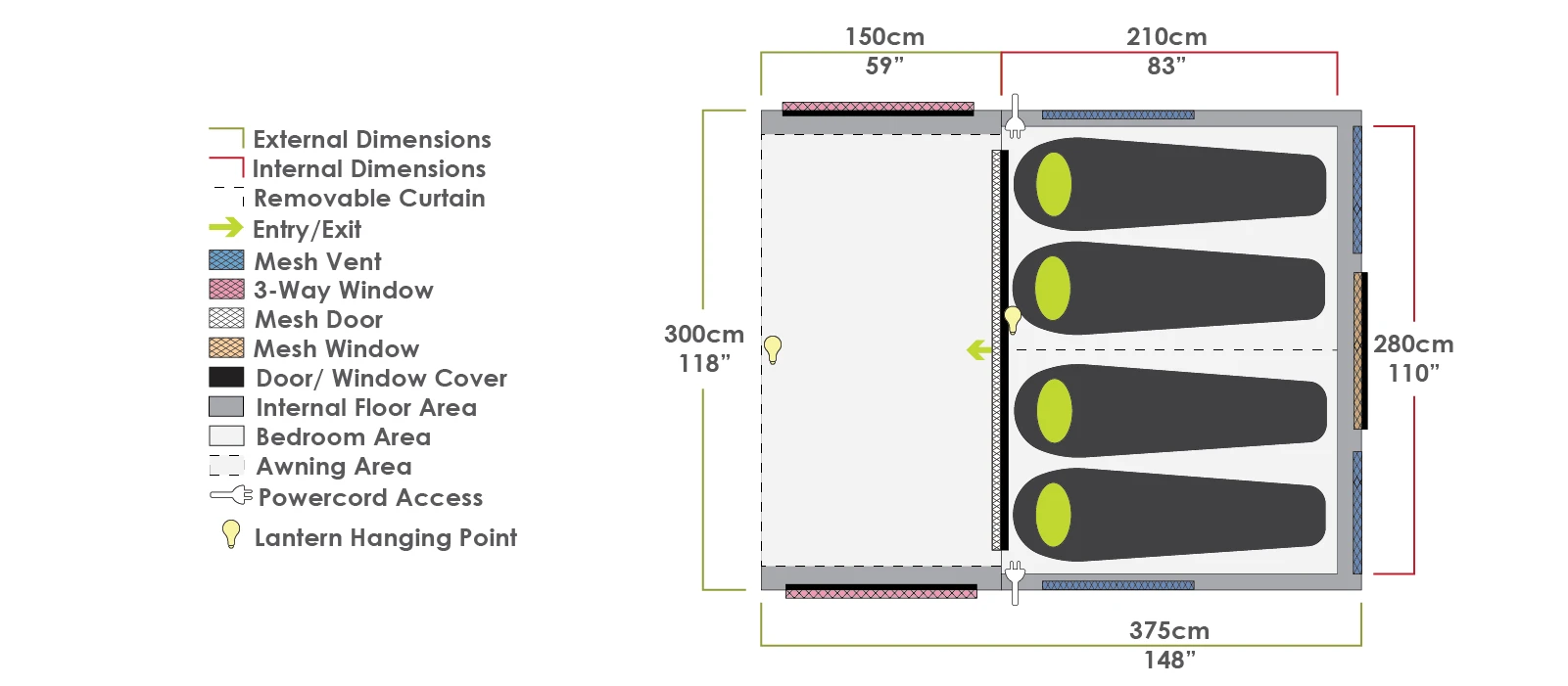 • It is important that lower vents are opened at all times to reduce condensation. During humid or damp conditions, it is recommended that the waterproof door covers are opened to expose the mesh layer, enabling additional airflow throughout your tent.