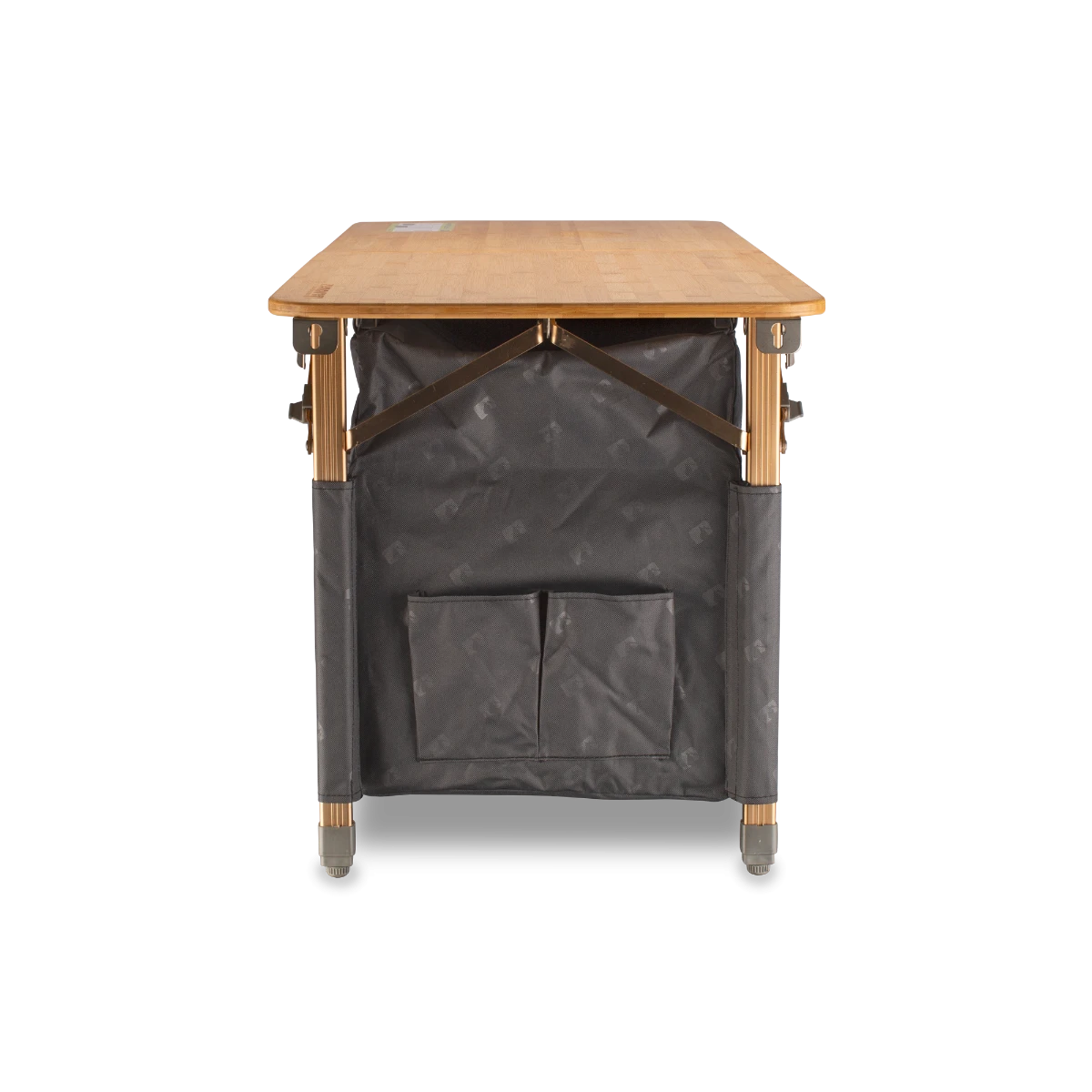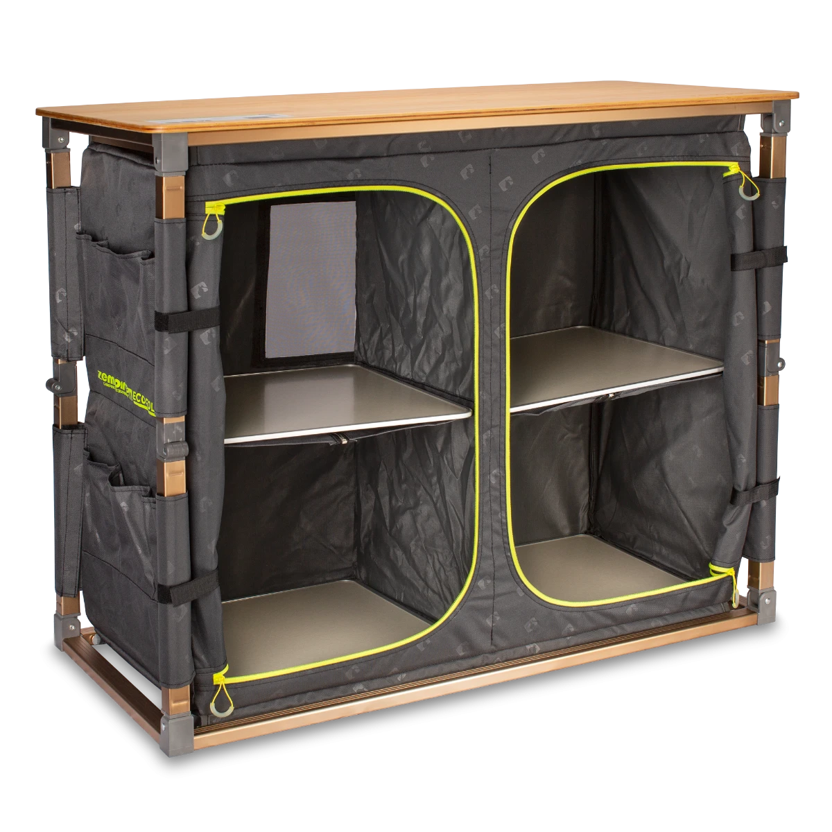 The adjustable height and wide bamboo tabletop make this adaptable twin cupboard perfect for bedroom, living or kitchen storage. The fully foldable frame design allows the cupboard to fold down small for travel with the cupboard and legs stored safely inside. Frame locks allow you to lock the frame into an open or closed position for extra stability and convenience.