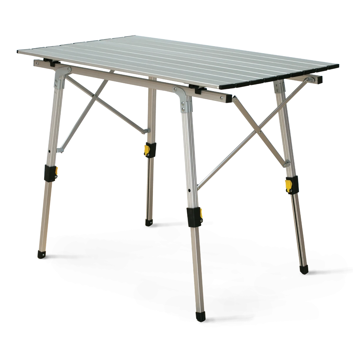 FRAME MATERIAL 19/22mm aluminium box tube TABLETOP MATERIAL Aluminium slat WEIGHT CAPACITY 30kg / 65lbs maximum PRODUCT WEIGHT 4.26kg / 9.38lbs TABLETOP DIMENSIONS 90 x 52cm / 35.4 x 20.5in HEIGHT 38 – 70cm / 15 – 27.6in PACKED DIMENSIONS (H-W-D) 92 x 17 x 12cm / 36.2 x 6.7 x 4.7in CARRY BAG MATERIAL 400D polyester TABLE & STORAGE FEATURES Adjustable height Adjustable legs Carry bag included Clip on table top Compact pack size Cross frame leg supports Easy build assembly Fully folding frame Light weight Removable table top Rust proof aluminium frame Waterproof table top CARRY BAG FEATURES Durable poly oxford material Zip closed carry bag