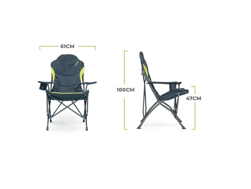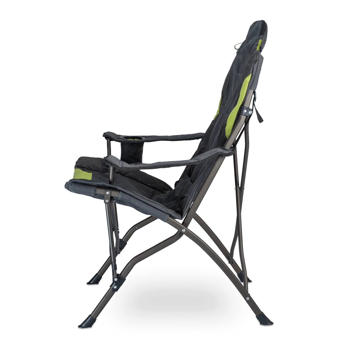 CHAIR FEATURES Adjustable arm height Back support brace Carry bag included Extra high back Fully folding Insulated cup holder Padded arm rests Padded seat Pillow pocket Rust resistant frame Single action assembly Stable flat feet
